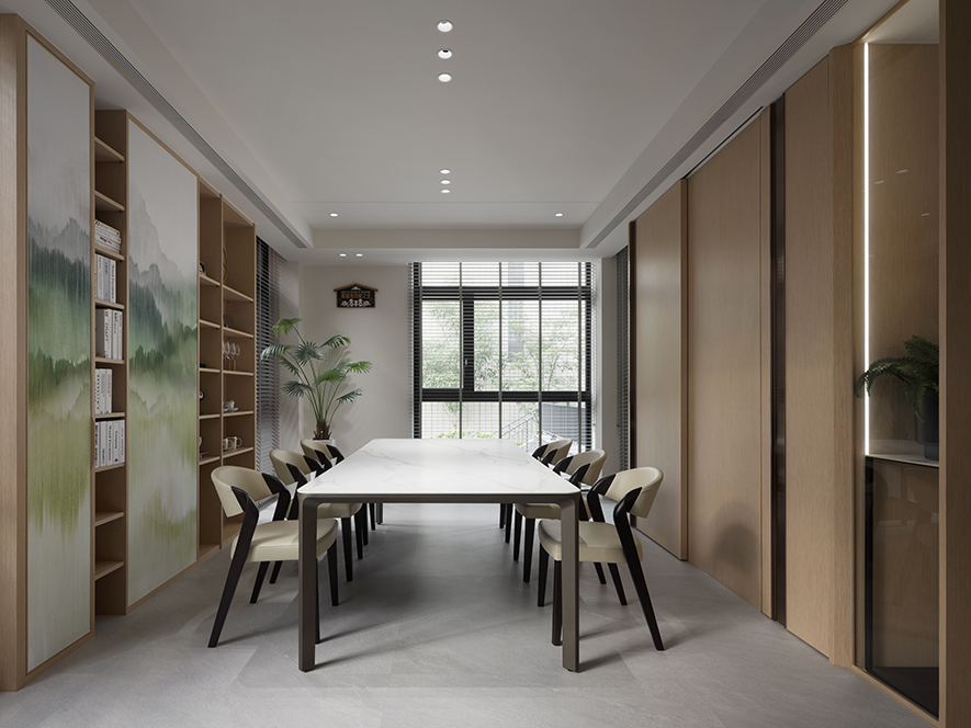 輕推俐落黑框的清玻拉門,進入無礙銜接的開放式餐廚區:廚房以深藍特殊塗料漫塗整面電器櫃、熱炒區下層櫃面及中島,藉細膩肌理層次勾勒一抹現代美學,上方高櫃的木紋,則源源蔓延至對側餐廳,透過大面木韻陳釀濃厚和暖的用餐氛圍;而窗畔交錯山水繪跡的端景書牆,更使此區跳脫傳統餐廳框架,賦予共享書房的嶄新功能,讓熱愛閱讀的家人們閒暇時自然齊聚於此,相伴彼此締留溫馨的書香時光。