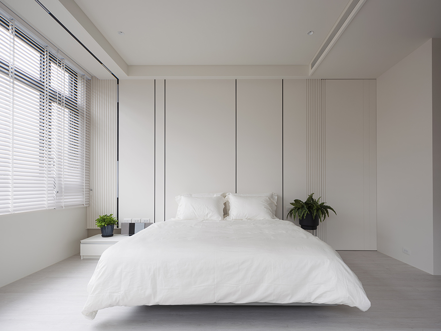 視線焦點的床頭主牆序列一道道垂直線條造型,以疏密各異的精妙分割比例,無聲為齊整畫面輕描簡練耐看的空間層次,其餘各處盡以極簡筆觸留白,刻劃一方潔白的寧謐天地,在流轉的自然光影及點點植株的生機中,營造整室清新放鬆氛圍,供居者沉澱身心、安然入眠。