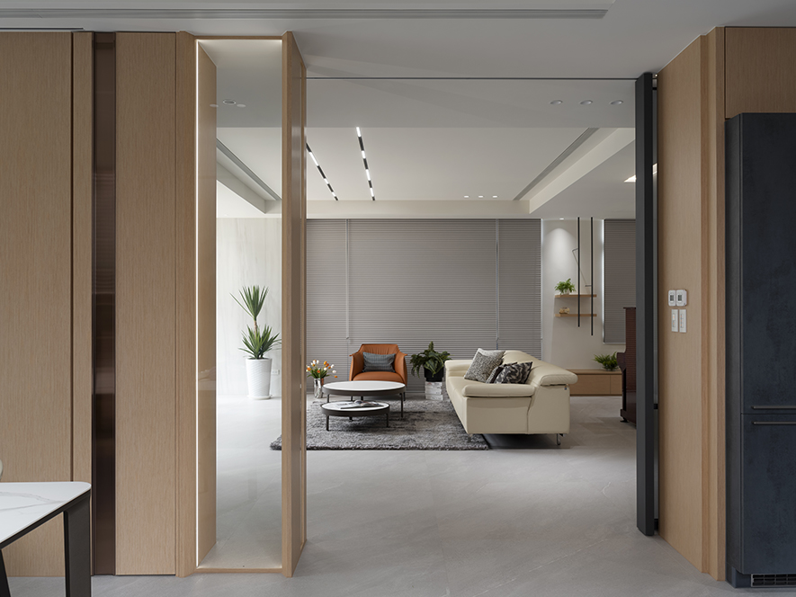 自然煦光流經大面落地窗,於客廳的淺白基調輕覆一層光紗,鋪展明朗輕快的生活情境,同時巧妙將戶外庭院樹景引入屋內,開闊視野、放大空間,配合米調沙發的柔和色澤與厚實絨地毯的柔軟觸感,為每位步入此處的居者及賓客,挹注無形舒緩身心靈的療癒體驗。無論聆聽家人巧手輕彈的悠揚琴音,或與親友談笑閒聊,此處皆以和柔明亮抱擁居者,讓日常中的每一刻都能從容自適。